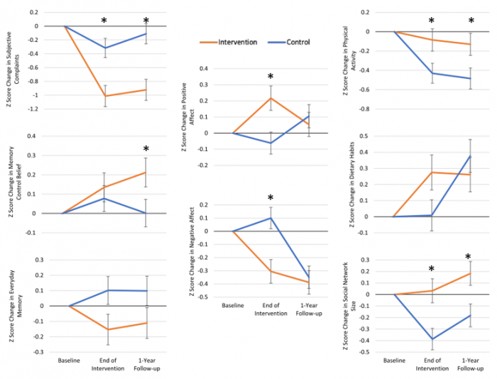 研究分别在干预前、干预结束后即刻和1年后(1年随访)通过7项认知测试(简易精神状态检查量表MMSE、蒙特利尔认知量表MoCA、听觉语言学习测验、配对联想学习测验、连线测验、数字广度倒背测验、言语流畅性测验)测量了被试认知能力的改变,并考察了被试主观认知能力(AD8、前瞻回溯记忆量表、记忆控制感量表)、积极和消极情感体验(生活满意度量表、幸福感量表、老化态度、流调中心用抑郁量表CES-D、广泛性焦虑障碍量表GAD-7、UCLA孤独感量表)、身体活动(老年人体力活动量表PASE)和饮食习惯(饮食习惯问卷)的变化。