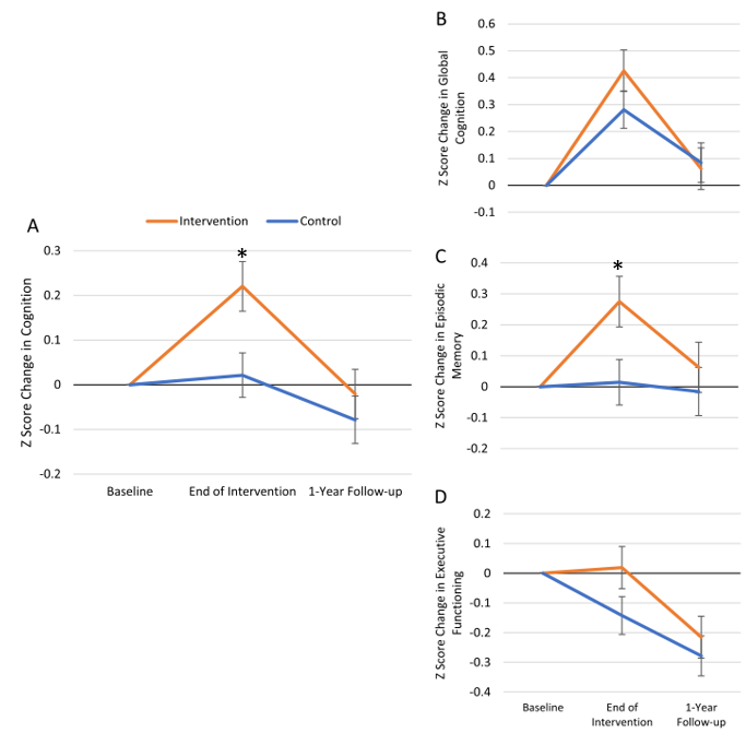 图2.干预组和对照组在认知能力(7项认知测验的综合,左A)、整体认知(MMSE和MoCA测验的综合,右B)、情节记忆(右C)和执行功能(右D)上随时间的变化。