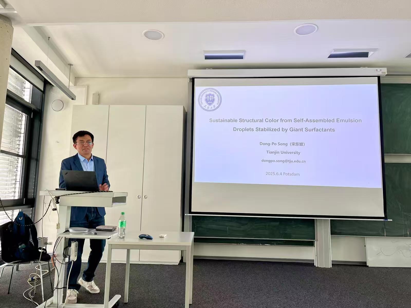 同时,宋东坡教授为马普所的师生带来了题为"Sustainable Structural Color from Self-Assembled Emulsion Droplets Stabilized by Giant Surfactants"的学术报告。报告详细介绍了团队在嵌段共聚物自发乳化、液滴自组装、结构色调控等方面的最新研究进展。报告吸引了来自不同研究组的30余名科研人员参加,包括博士后、博士生和技术人员。与会人员对报告中提出的热力学模型表现出极大兴趣,与宋东坡教授进行了热烈的学术讨论,这些讨论也为后续研究提供了新的思路。