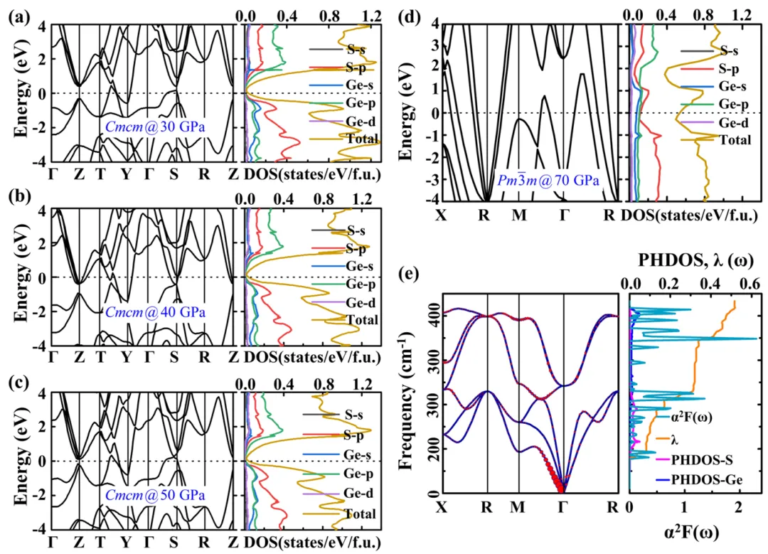 3.理论计算与实验验证结合:通过密度泛函理论(DFT)计算与高压实验相结合,深入揭示了GeS超导性的电子机制,特别是电子-声子耦合在超导中的作用。