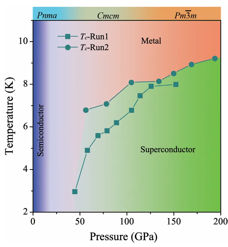 实验发现,GeS在约44.5GPa时发生金属-超导转变,且超导行为在整个研究压力范围内保持稳健,最高Tc达到9K。此外,在减压过程中,Tc异常升高至11K,揭示了高压下GeS超导性的独特性质。