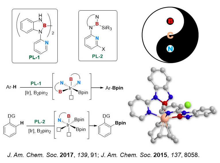 催化:以硼、氮为配位原子的新配体设计及其在催化反应发现、改进中的应用。碳元素是有机化学的中心,与碳相邻的硼与氮元素则在电负性、价电子数等方面可以看做阴阳两极,因此可以用来调节有机化合物或催化剂的化学、物理性质。例如,我们首次将N,B-双齿配体引入均相催化领域,发展了高效的催化惰性键直接硼化反应,从简单的芳烃一步可以制备药物、材料合成中广泛使用的有机硼化合物。