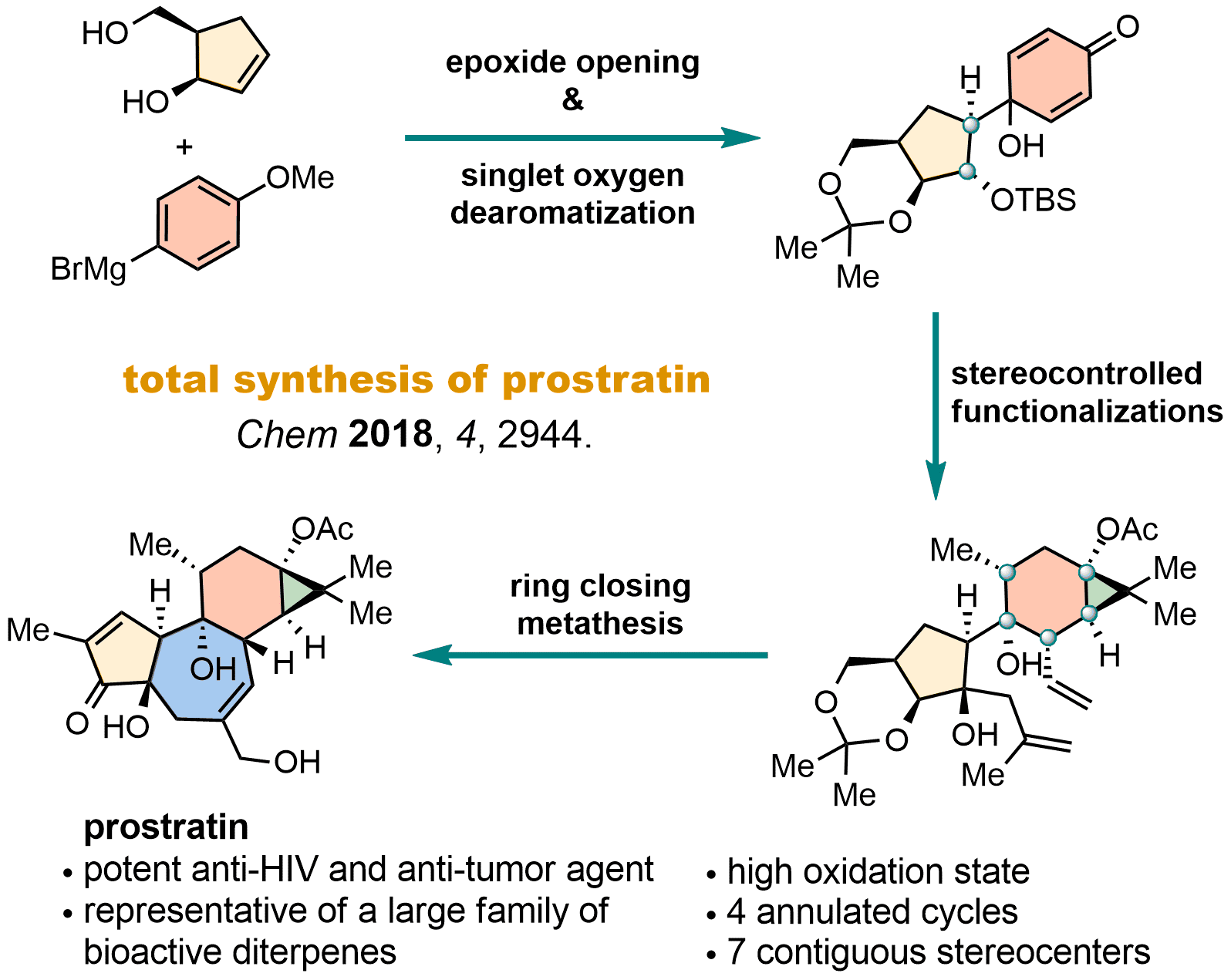 天然产物:自然的进化造就了生物间相互作用的平衡。许多天然化合物具有优秀的生物活性,一直以来都是人类对抗疾病的有效药物来源。针对艾滋、肿瘤等重大疾病,我们选择具有治疗潜力的天然产物,通过化学合成、结构修饰来寻找优化的药物结构。例如,巴豆烷、瑞香烷二萜是表现出多种重要生物作用的一大家族天然产物,但由于其高度复杂的结构,药物研发受到极大阻碍。其中,prostratin是一个有望通过“shock and kill”途径根治艾滋病的分子,我们通过有效的、模块化的合成策略,完成了它的首次全合成,目前正在进行它的结构优化工作。