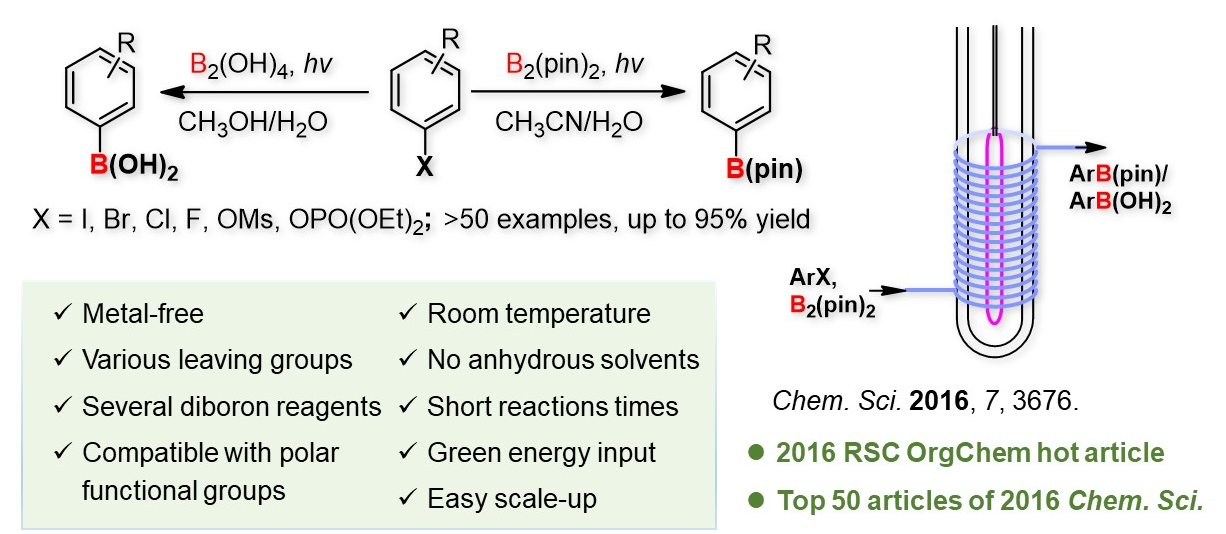 流动化学:传统化工和制药工业采用间歇式釜式反应,存在高危险、高能耗、低效率等许多问题。与此相比,连续流动微通道反应则具有本质安全、绿色、高效、无放大效应、易于自动化、重复性高等许多优势,因此代表了未来化学工业发展的趋势。本课题组将化学与工程充分结合起来,设计和利用连续流动微通道装置,完成在传统间歇式条件下难以实现的反应,或开发更加安全、绿色的方法。例如,我们发现和发展了连续流动光照条件下芳基硼酸酯的制备新反应。该反应具有官能团兼容性好、对水不敏感、操作简单、可放大等特点,避免了传统制备方法中无水溶剂、敏感试剂或贵金属催化剂的使用。