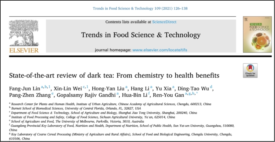 近日,中国农业科学院都市农业研究所联合美国中佛罗里达大学、上海交通大学、墨尔本大学、中山大学等研究人员在国际食品顶级期刊《Trends in Food Science & Technology》(影响因子11.077)上发表题为“State-of-the-art review of dark tea: From chemistry to health benefits”的高水平综述。中国农业科学院都市农业研究所为第一通讯单位,植物与人体健康机理创新团队首席科学家甘人友博士为本文通信作者。这项工作得到了国家重点研发计划(No. 2018YFC1604400)、国家自然科学基金(No. Y2020XK05)和国家农业科技中心地方财政项目(No. NASC2020KR02)等支持。