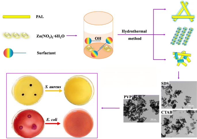 ZnO/palygorskite nanocomposites were facilely synthesized as antibacterial agent by a hydrothermal method using different types of surfactants including sodium dodecyl sulfate, polyvinyl pyrrolidone and cetyltrimethylammonium bromide. The nanocomposites were characterized by Fourier transform infrared spectroscopy, X-ray diffraction field emission scanning electron microscopy, transmission electron microscope, energy dispersive spectrometer, Brunauer–Emmett–Teller analysis and zeta potential. The results showed that the morphologies and antibacterial properties of ZnO/palygorskite nanocomposites could be controlled by changing the types of surfactants. The minimum inhibitory concentration of ZnO/palygorskite nanocomposites prepared with sodium dodecyl sulfate against E. coli was 1.5 mg/mL, while it was 0.5 mg/mL for ZnO/palygorskite prepared with cetyltrimethylammonium bromide against S. aureus. The experimental results suggested that the ZnO/palygorskite nanocomposites might be served as a potential antibacterial agent in animal feeding.Graphical Abstract