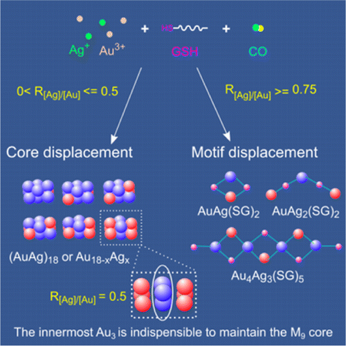 硫醇盐保护的金属纳米团簇的物理和化学性质高度依赖于它们的团簇组成。通过将两种贵金属并入一个簇中,可以进一步丰富这种理化特性。在这里,我们报告通过采用简单的CO还原方法有效合成硫醇盐保护的(AuAg)18簇(或Au 18- x Ag x(SR)14簇)。Au 18- x Ag x(SR)14的成分和电子/光学性质通过调节Ag与Au的进料比可以合理地调节团簇。实验数据还表明,进入的Ag原子将首先取代核中的Au原子,并且最多可以将六个Ag原子掺入Au 18(SR)14的结构中。更有趣的是,掺杂六个以上的Ag原子会导致Au 9核塌陷,而进入的Ag原子只会进入基序部位。对掺杂的AuAg团簇的组成和光学性质的详细研究最终凸显了最里面的Au 3核在维持Au 18- x Ag x(SR)14团簇的完整结构中的关键作用。