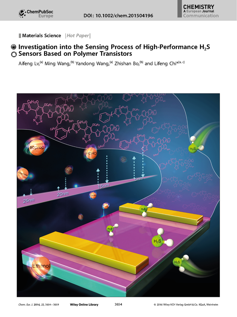 H2S Sensors High performance H2S sensors were successfully fabricated through the use of polymer field-effect transistors (FETs). Film thickness is strongly related with achievement of optimal sensitivity. Mechanism investigation shows that desorption increases faster than absorption for analyte molecules in the polymer film while both speed rise with decreasing film thickness. More information can be found in the Communication by L. Chi et al. on page 3654 ff.